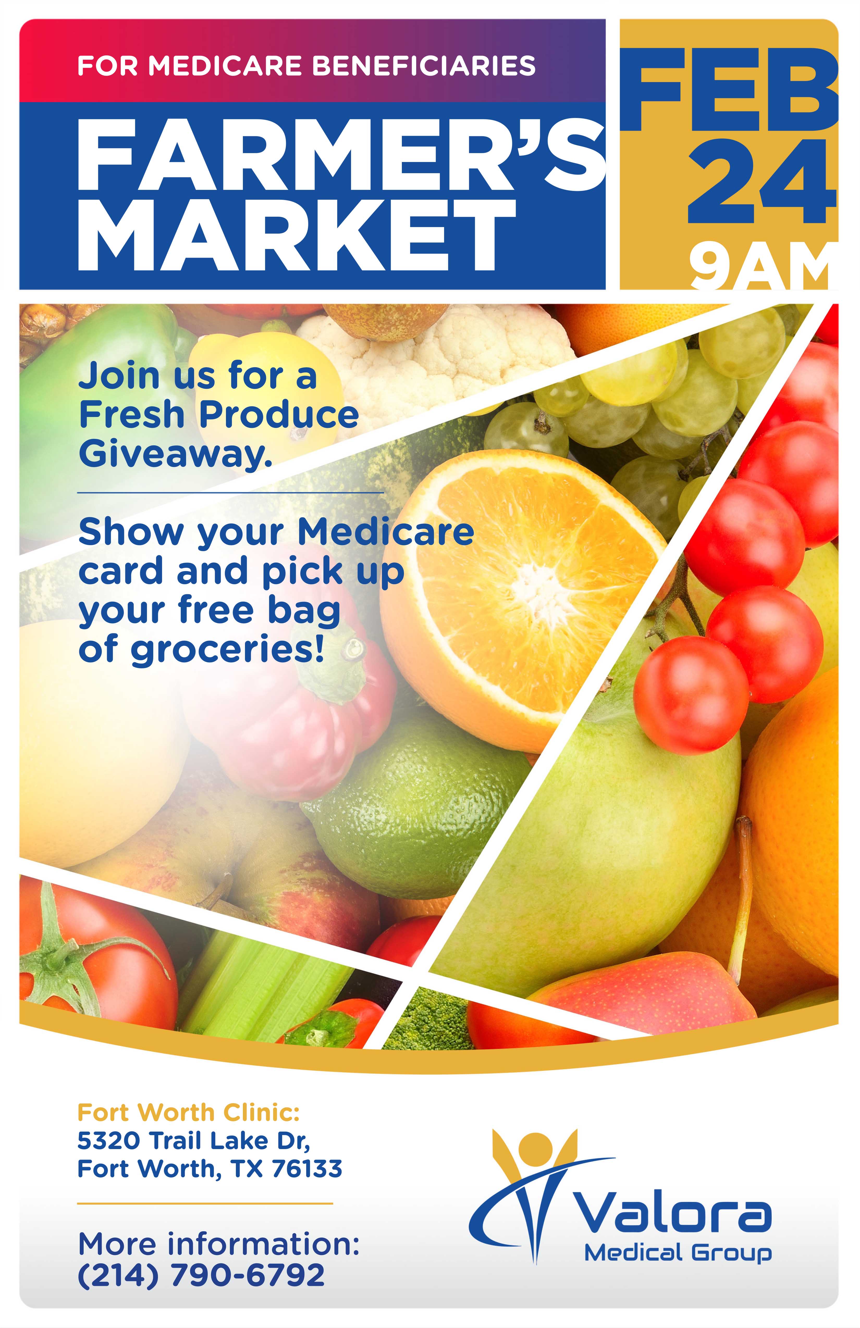 Get fresh and healthy! Join us for a Farmer’s Market Fresh Produce Giveaway at Valora Medical Group’s Fort Worth Office. Show your Medicare card to receive a free bag of groceries! Bring a friend and enjoy this delicious opportunity.