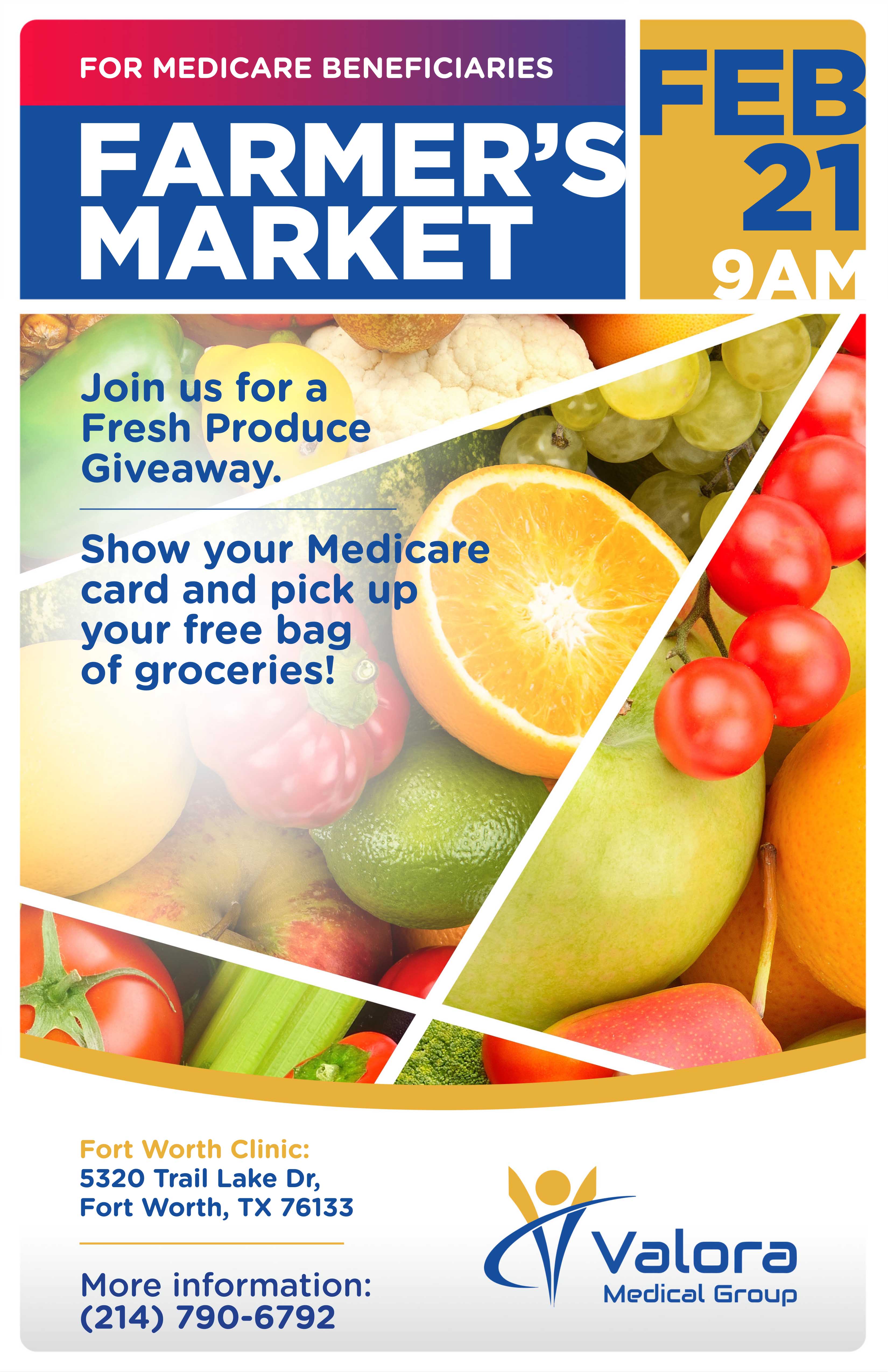 Get fresh and healthy! Join us for a Farmer’s Market Fresh Produce Giveaway at Valora Medical Group’s Fort Worth Office. Show your Medicare card to receive a free bag of groceries! Bring a friend and enjoy this delicious opportunity.