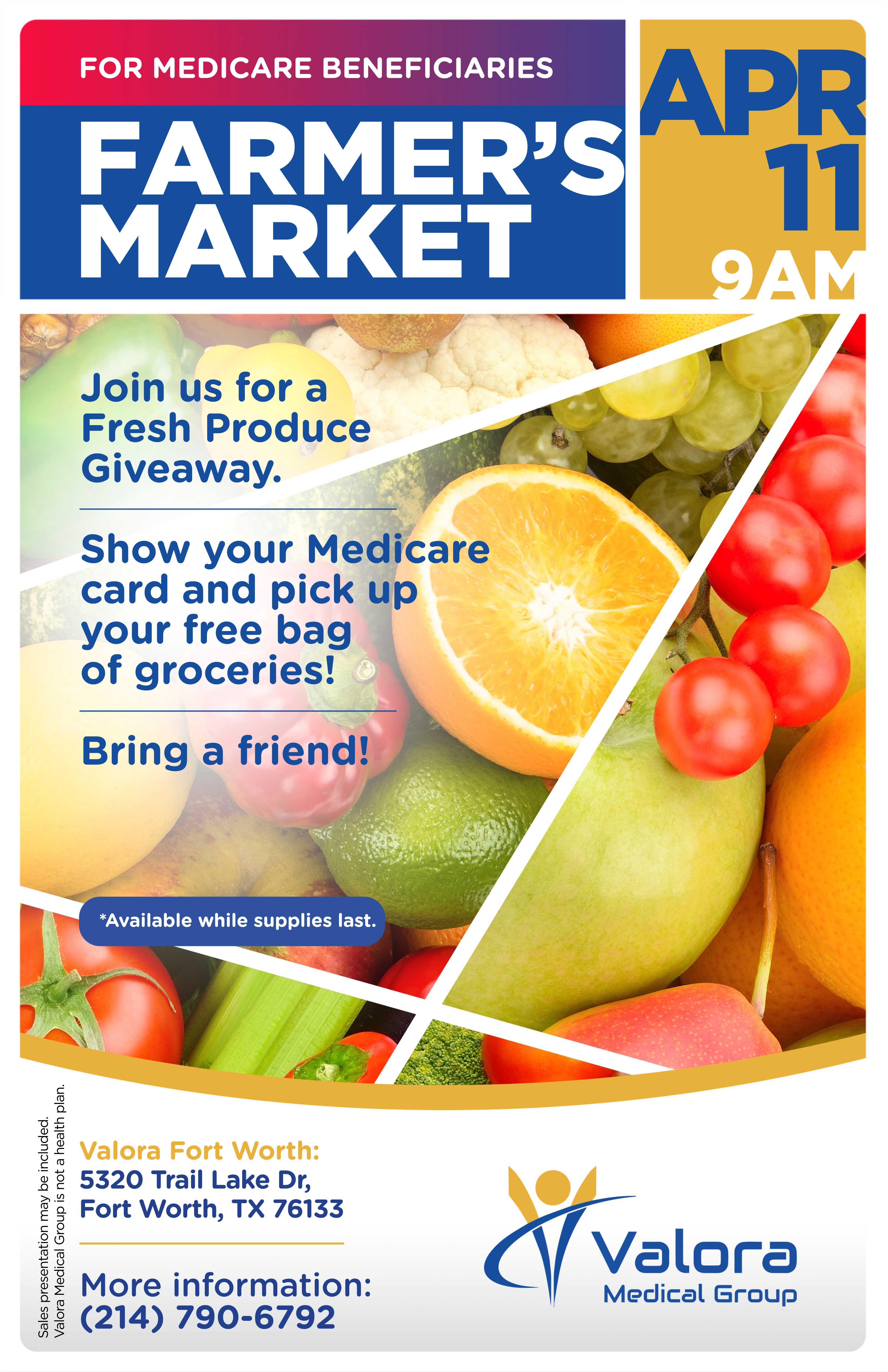 Get fresh and healthy! Join us for a Farmer’s Market Fresh Produce Giveaway at Valora Medical Group’s Fort Worth Office. Show your Medicare card to receive a free bag of groceries! Bring a friend and enjoy this delicious opportunity.