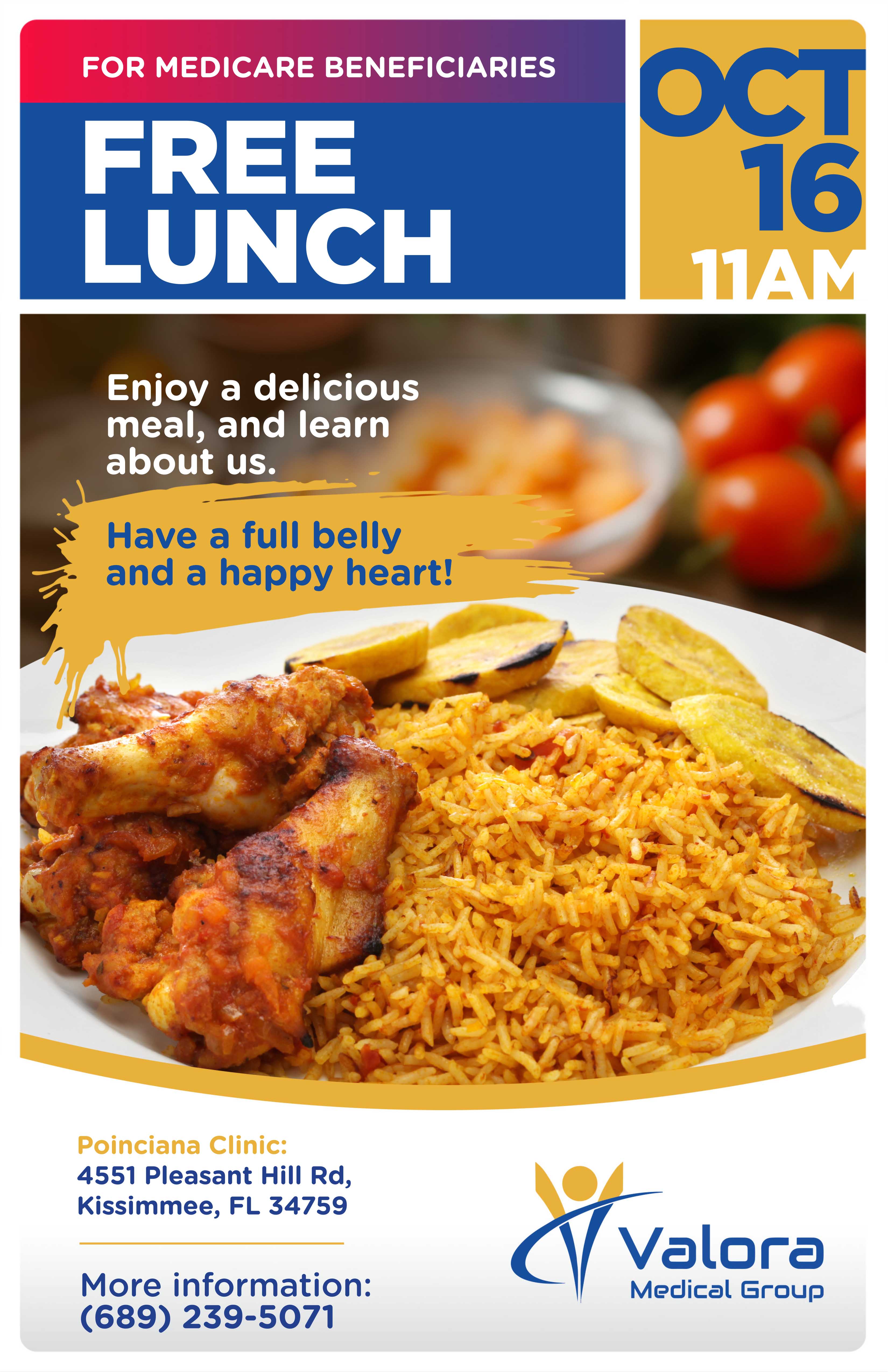 Join us for a FREE lunch on October 16 at 11 AM! If you’re a Medicare beneficiary, enjoy a delicious meal, meet friendly faces, and learn how Valora Medical Group can support your health.