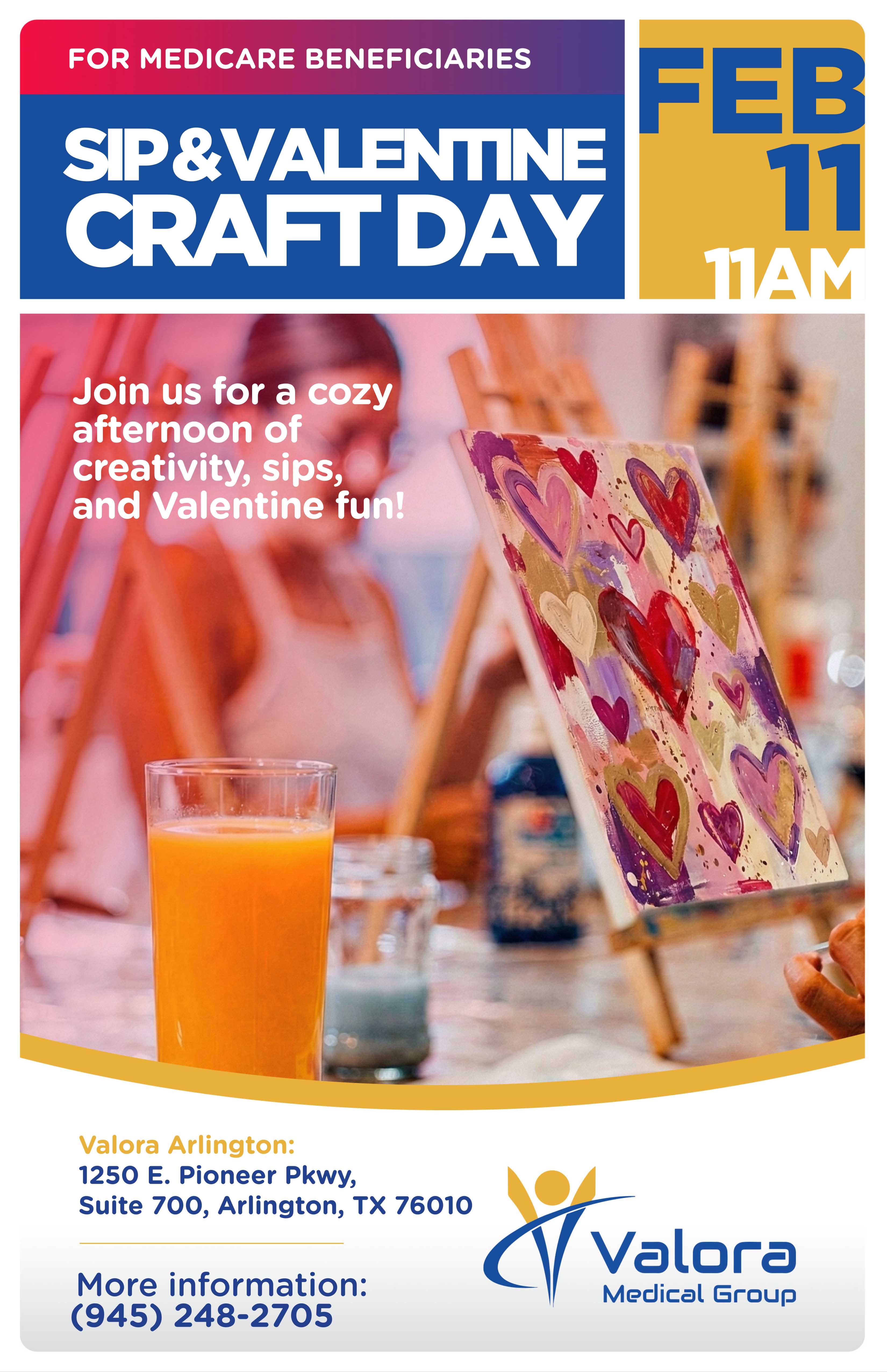 Join us for our Sip & Valentine Craft Day, a cozy afternoon filled with creativity, refreshing sips, and Valentine fun made especially for Medicare beneficiaries! Bring a friend and enjoy a relaxing, festive experience.