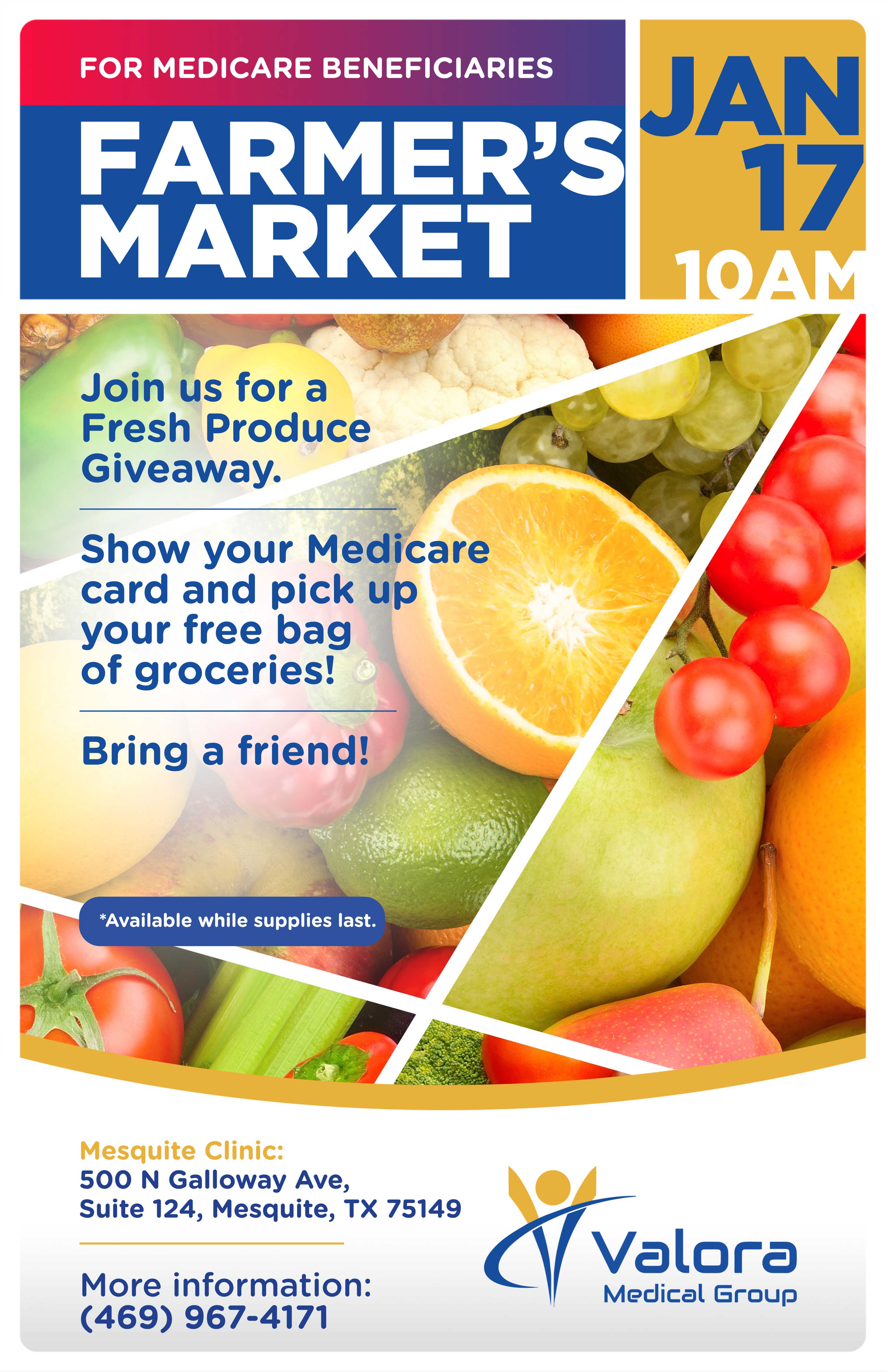 Get fresh and healthy! Join us for a Farmer’s Market Fresh Produce Giveaway. Show your Medicare card to receive a free bag of groceries! Bring a friend and enjoy this delicious opportunity.