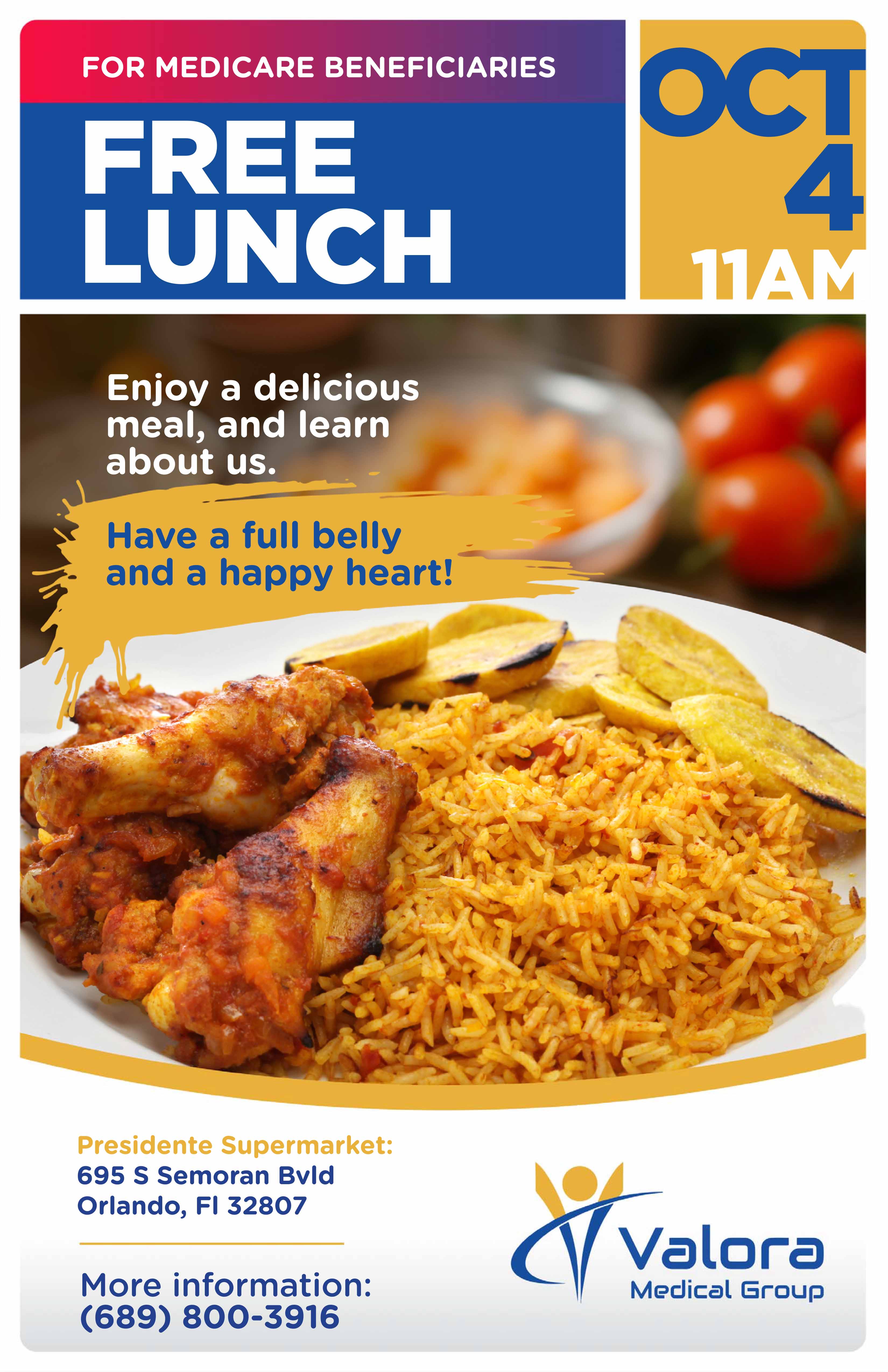 Join us for a FREE lunch on Presidente Supermarket. If you’re a Medicare beneficiary, enjoy a delicious meal, meet friendly faces, and learn how Valora Medical Group can support your health.