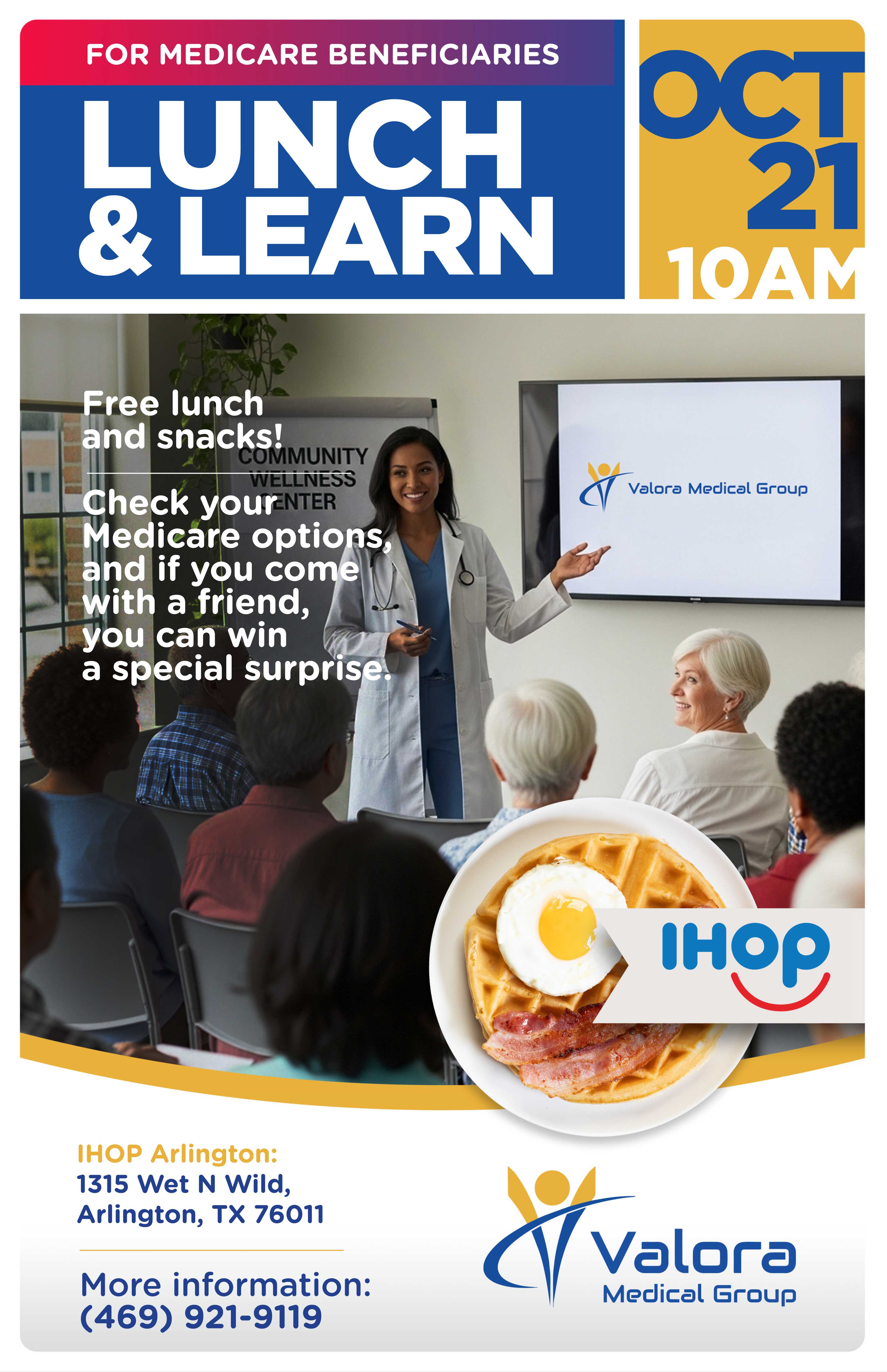 Learning about Medicare has never been this enjoyable! Join Valora Medical Group for a Lunch & Learn at IHOP, featuring free food, expert insights on your Medicare options, and special surprises for attendees who bring a friend.